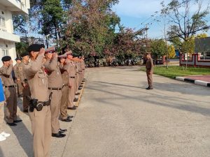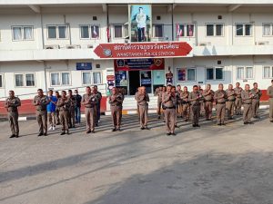 พ.ต.อ.พงศ์อนันต์ รักษาชาติ ผกก.สภ.วังตะเคียน ได้เรียกแถวข้าราชการตำรวจในปกครองเข้าแถวเคารพธงชาติ