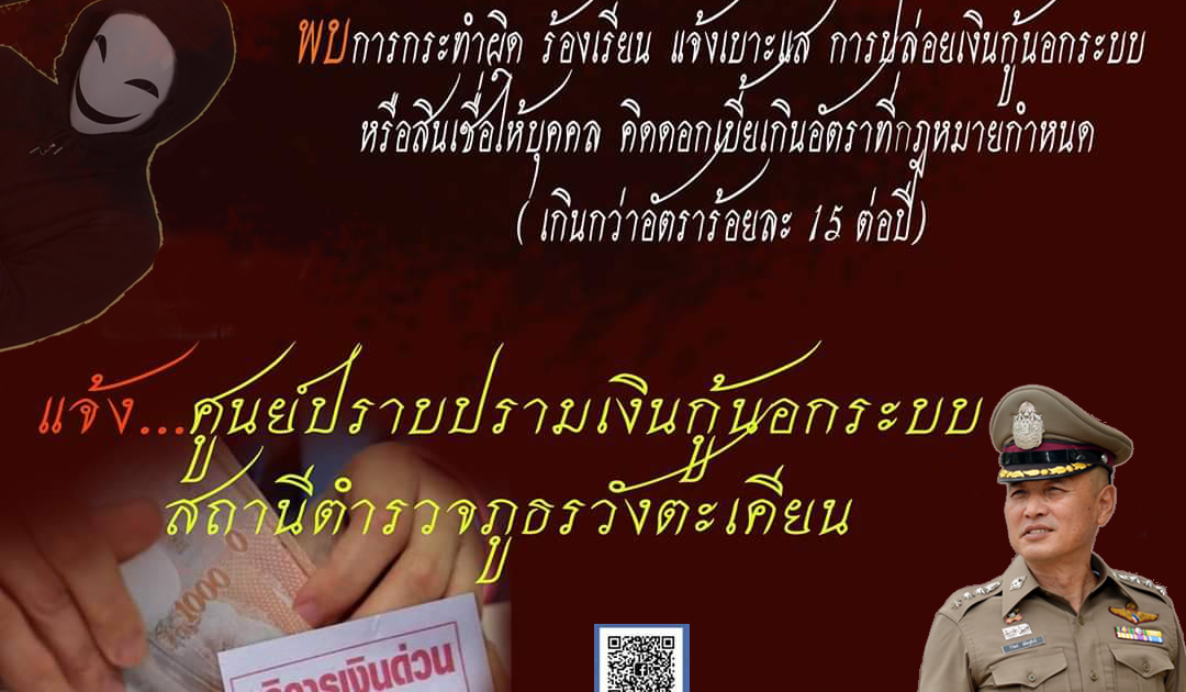 พบการกระทำผิด ร้องเรียน แจ้งเบาะแส การปล่อยเงินกู้นอกระบบ หรือสินเชื่อให้บุคคล คิดดอกเบี้ยเกินอัตราที่กฎหมายกำหนด ( เกินกว่าร้อยละ 15 ต่อปี) แจ้งเบาะแสมายัง ศูนย์ปราบปรามเงินกุ้นอกระบบ สภ.วังตะเคียน โทร 037-576581 หรือ 161 หรือ เพจ: สถานีตำรวจภูธรวังตะเคียน